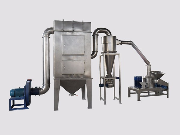 物料由料斗經(jīng)螺旋輸送器進入粉碎室,被高速旋轉(zhuǎn)的刀片剪切粉碎,通過負壓風運的方法把物科運入旋風分離器、袋式除塵器,排出物料達到產(chǎn)品的要求。
